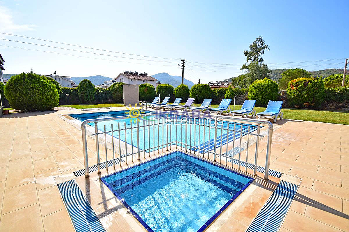 Şezlong, şemsiye, bahçe mobilyaları, güneşlenme terası, çocuk havuzu ve araç park yeri bulunmaktadır.